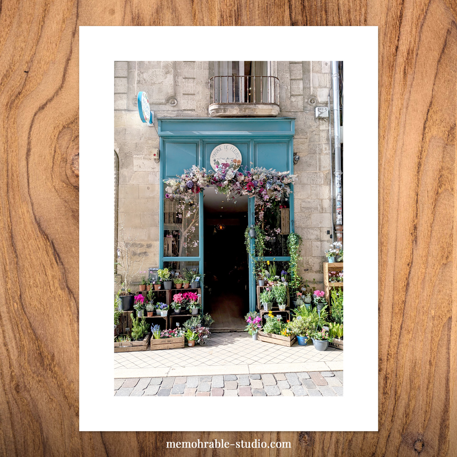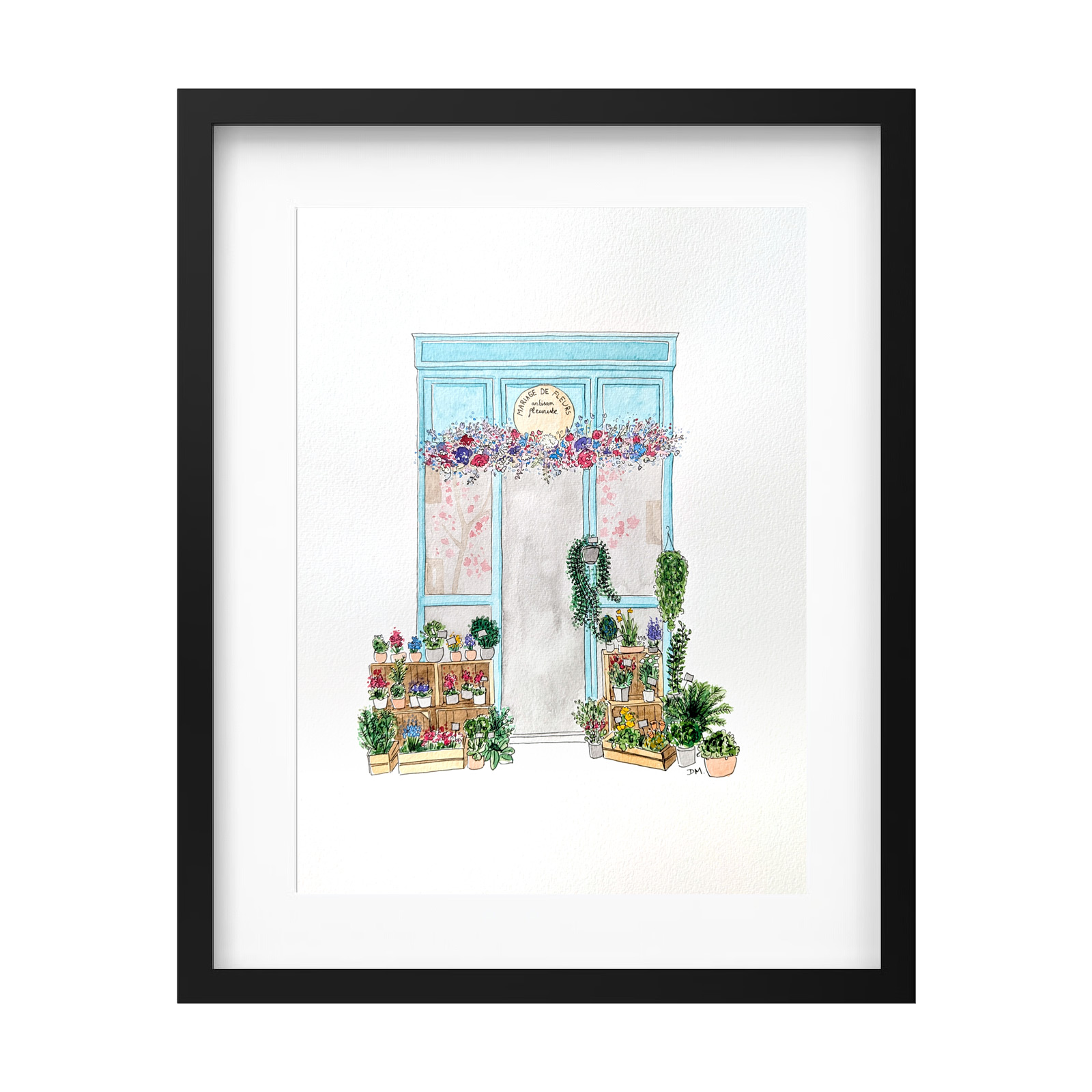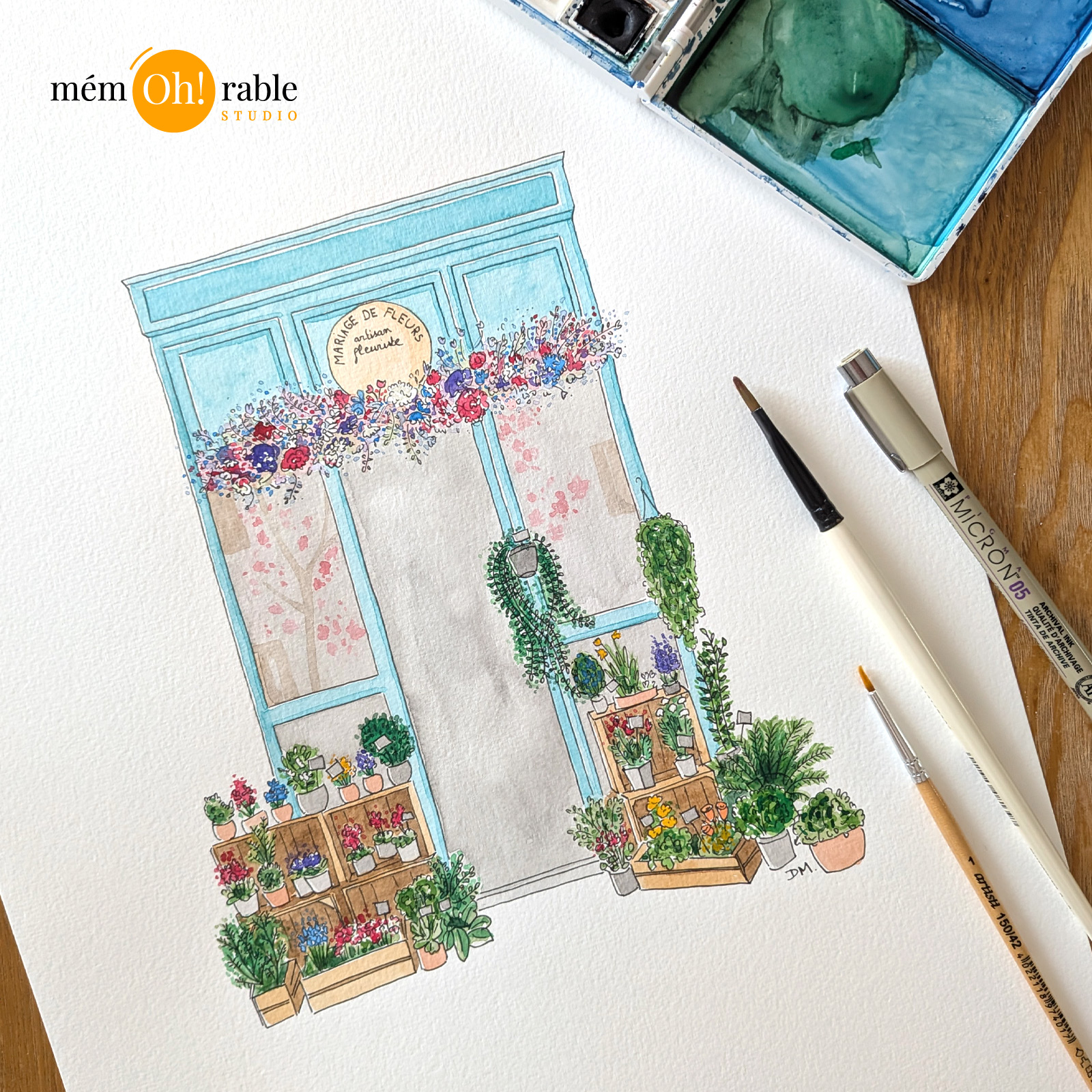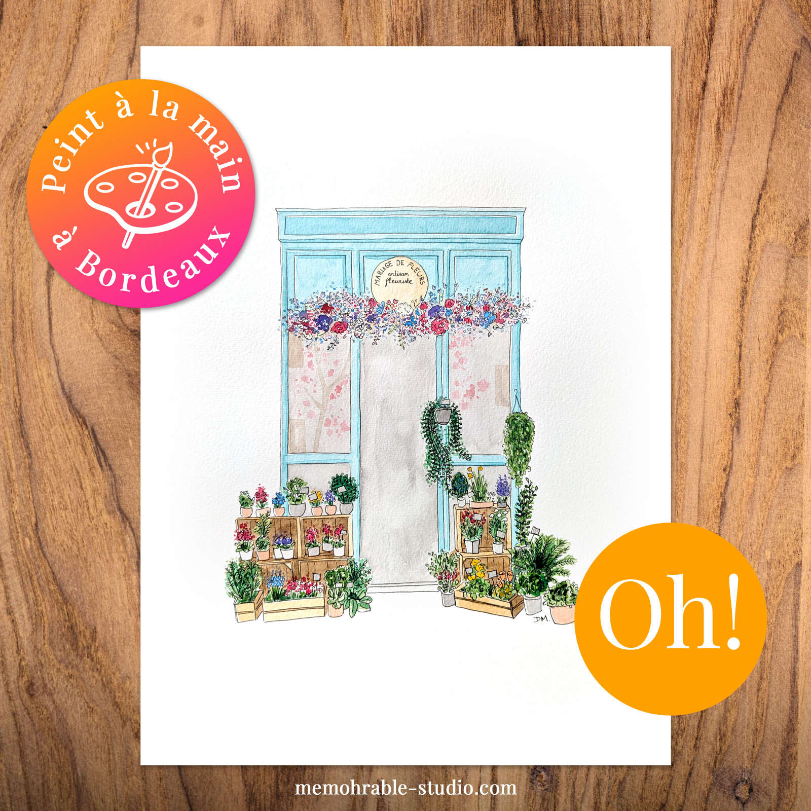 Cette boutique de fleurs existe réellement, il s’agit du fleuriste « Mariage de fleurs », situé Rue Piliers de Tutelle, à Bordeaux. Pour réaliser ce tableau, j’ai pris en photo cette jolie boutique, pour ensuite m’en servir de modèle.